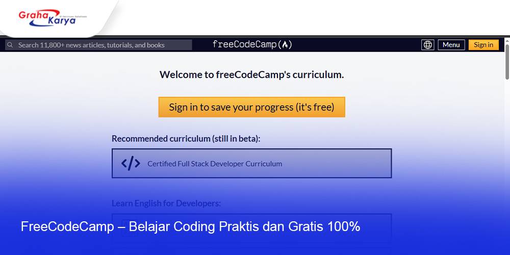 Meskipun berbahasa Inggris, FreeCodeCamp tetap banyak digunakan oleh pengembang Indonesia karena struktur pembelajarannya yang jelas dan berbasis proyek. Anda bisa langsung belajar melalui browser, mulai dari dasar HTML dan CSS hingga ke React, D3.js, dan TensorFlow. Setelah menyelesaikan modul, Anda akan mendapat sertifikat gratis yang bisa ditambahkan ke LinkedIn atau portofolio kerja.