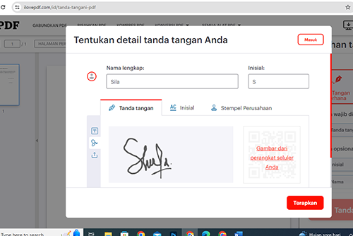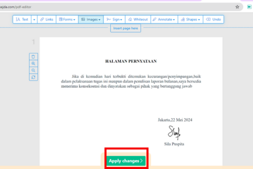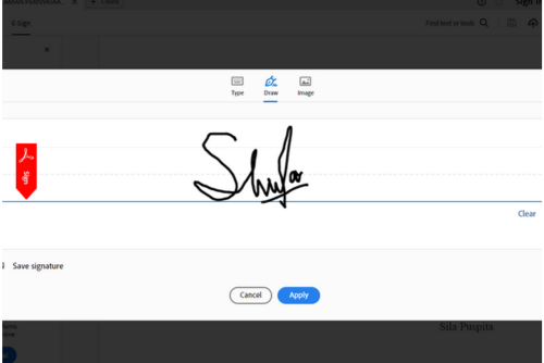 Setelah tanda tangan jadi, klik apply untuk memasukkan tanda tangan ke dokumen.